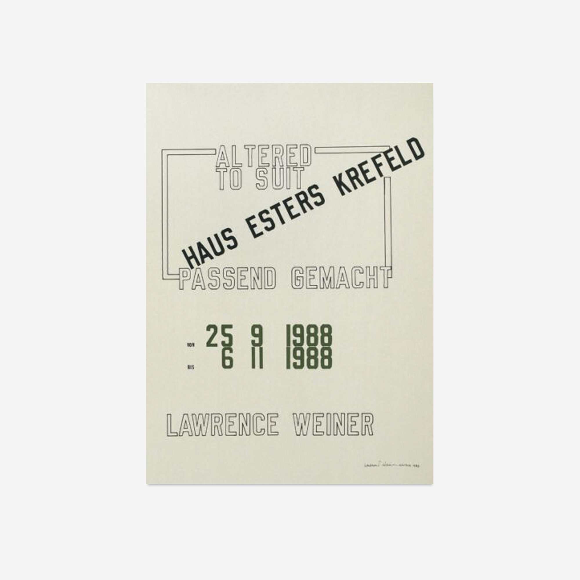 Influential Conceptual artist Lawrence Weiner is known for his language-based sculpture and works pursuing inquiries into language and a radical redefinition of the artist/viewer relationship. In pieces like A Square Removal From a Rug in Use (1969) or Encased By + Reduced to Rust (1986), the value exists in the idea itself, as expressed in words. Considering language to be a sculptural material and believing that a construction in language can function as sculpture as adequately as a fabricated object, Weiner's works operate beyond the specificity and constraints of traditional presentation, inspiring artists like Barbara Kruger and Felix Gonzalez-Torres.